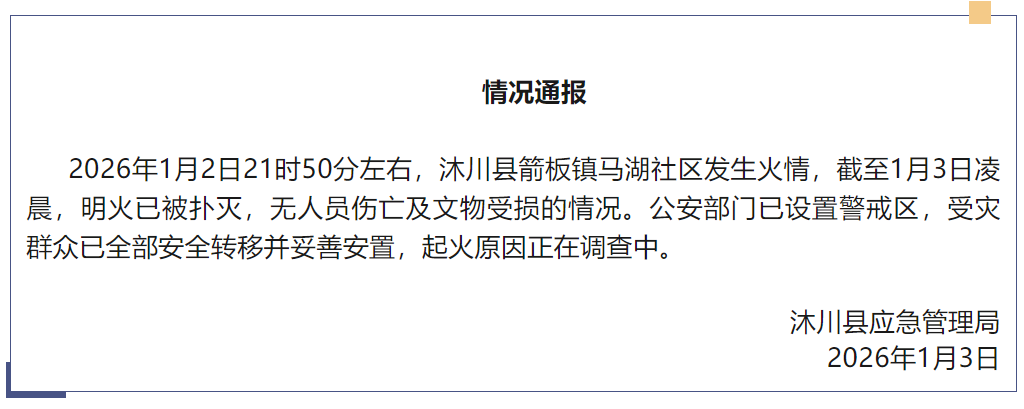 中国网1月3日讯 四川省乐山市沐川县应急管理局发布情况通报:1月2日21时50分左右,沐川县箭板镇马湖社区发生火情,截至1月3日凌晨,明火已被扑灭,无人员伤亡及文物受损的情况。起火原因正在调查中。
