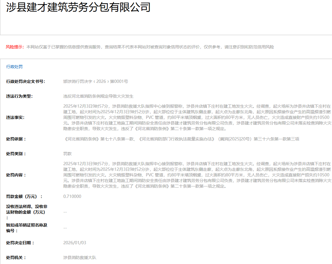 文号“邯涉消行罚决字﹝2026﹞第0001号”行政处罚决定书显示,2025年12月3日9时57分,涉县消防救援大队指挥中心接到报警称,涉县井店镇下庄村在建工地发生火灾。经调查,起火场所为涉县井店镇下庄村在建工地,起火时间为2025年12月3日9时52分许,起火部位位于主体建筑东侧走廊,起火点为走廊东北角,起火原因系焊接作业产生的高温焊渣引燃周围可燃物引发的火灾。火灾烧毁塑料杂物、PVC管道,约80平米墙顶烟熏,过火面积约80平方米,无人员伤亡,火灾造成直接财产损失约10500元。涉县井店镇下庄村在建工地施工期间消防安全责任由涉县建才建筑劳务分包有限公司负责,涉县建才建筑劳务分包有限公司未落实检查消除火灾隐患安全职责,导致火灾发生。