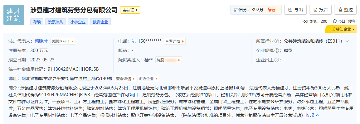 启信宝显示,涉县建才建筑劳务分包公司成立于2023年,注册资本300万元,注册地位于河北省邯郸市,法定代表人为杨建才,所属行业为公共建筑装饰和装修。