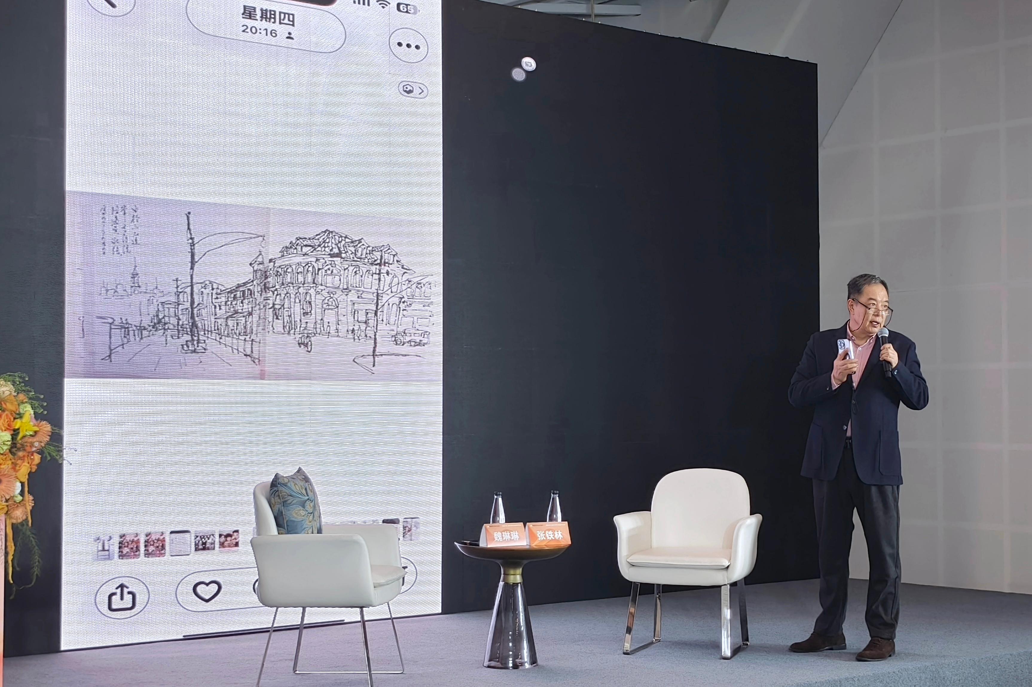 他的日记不写情绪,只记“流水账”——今天见了谁、去了哪里、在哪家餐馆吃饭,甚至每道菜的价格,都会记录下来。有时还会画下来,比如桌上有几个盘子、几只碗。他现场翻出手机里保存的旧画,有三十年前在香港拍电影时随手绘下的街景,有上世纪八十年代在上海四川中路留下的笔触,还有在四川拍电影时勾勒的当地茶馆,以及在日本拍摄电影时记录下的寻常人家生活片段。“我也不知道为什么要记下这些,只是对这些瞬间充满无限兴趣。”