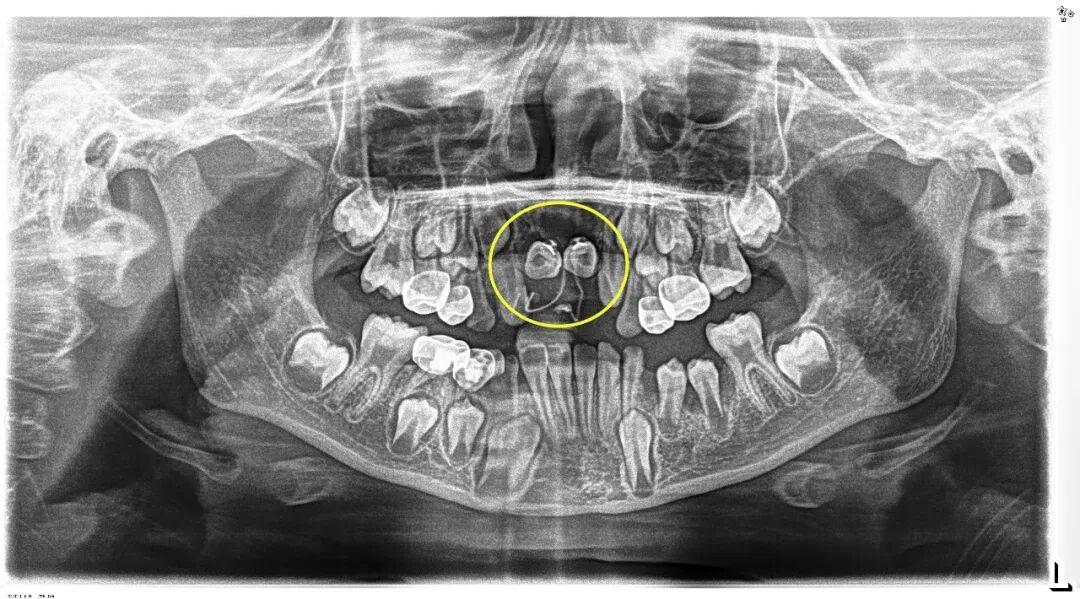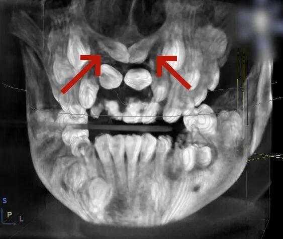 小胡已经9岁了,本该完成换牙的“新门牙”却迟迟没有萌出的迹象。家长带着他来到青岛市妇女儿童医院检查,拍摄X光片后发现,小胡的上颌骨内竟然埋伏着2颗多生牙,这两颗“不速之客”横着长在门牙牙根处,位置高至鼻底,还伴随唇向倾斜,阻碍了恒中切牙的正常萌出。