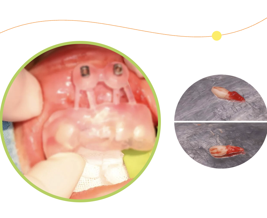 埋伏牙一旦发现,应及早处理。针对小胡的情况,口腔团队在完成多生牙的拔除后,为埋伏牙粘接牵引装置,通过温和的正畸力对受影响的恒中切牙进行“牵引导萌”,“拉”回正常生长轨道。