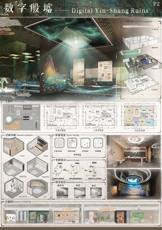 设计说明:殷墟文化作为中国古代文明的重要组成部分,承载着丰富的历史信息和深厚的文化底蕴,本设计将殷墟文化与现代科技结合,通过提取、分解和重组殷墟文化的特色元素,创新性地融入空间设计,打造一个具有互动性和沉浸感的数字化展厅。