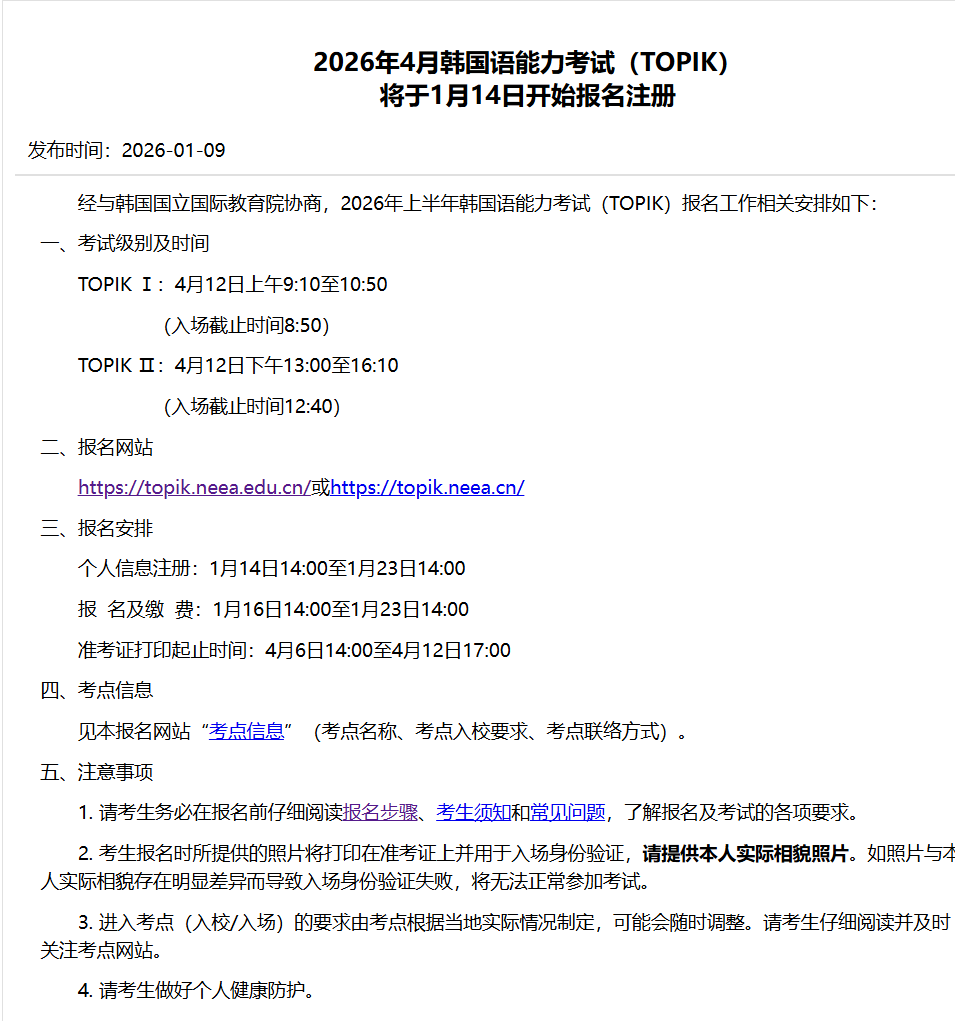 鲁网1月13日讯教育部教育考试院近日发布通知,2026年4月举办的韩国语能力考试(第105届TOPIK)报名通道将于1月14日下午2点正式开放。本次考试仍在中国大陆地区通过官方指定网站统一报名,以下是相关安排提醒。