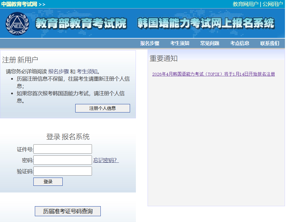 1、考生需登录教育部教育考试院韩国语能力考试报名系统进行注册并完成缴费。网站地址为:https://topik-main.neea.cn/