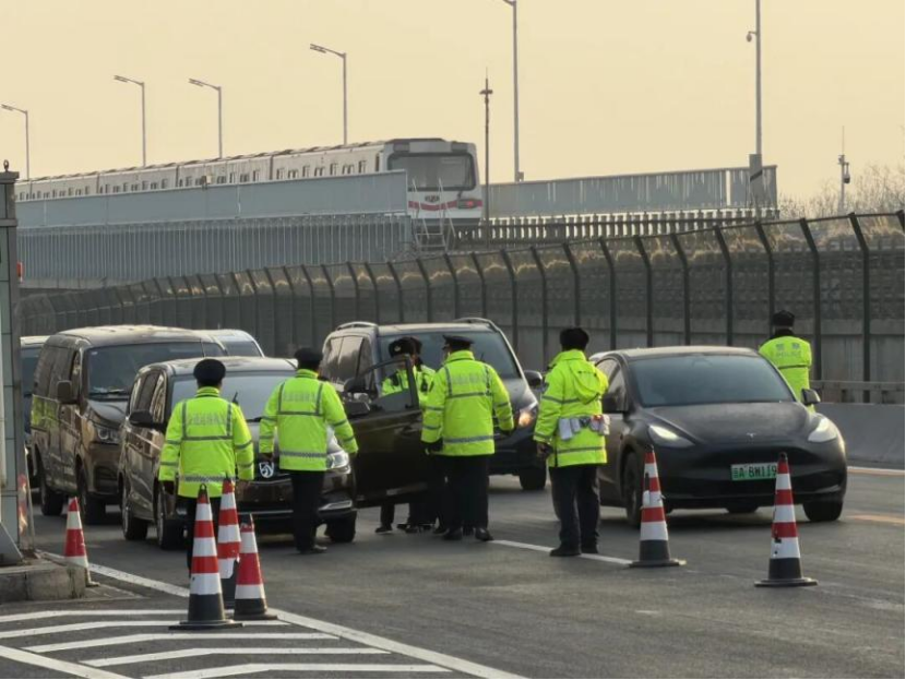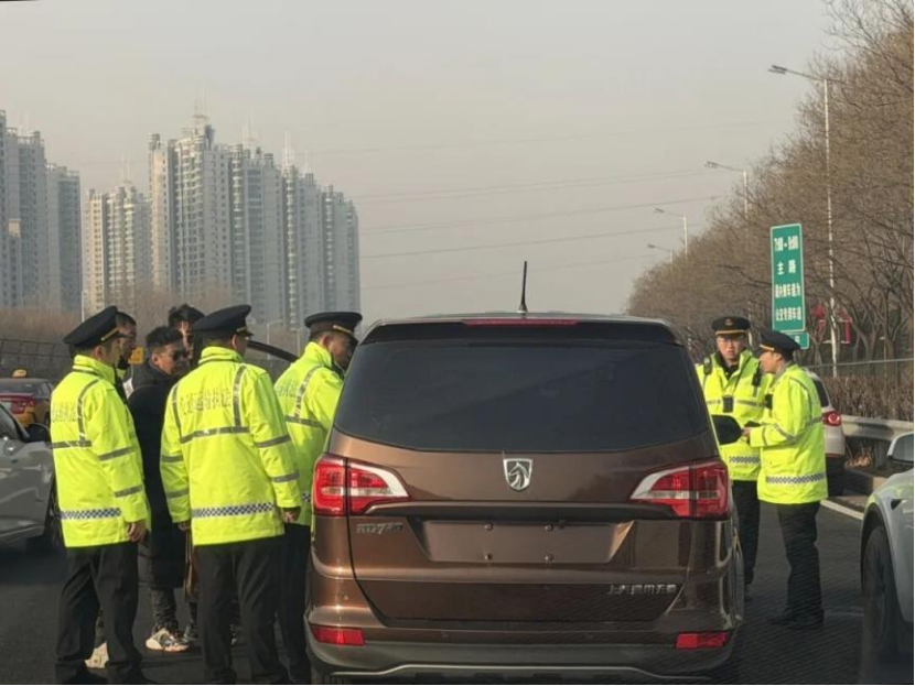 早上8点半,在京通快速路进京方向双桥收费站入口处路面较宽的路段,交警拦停多辆没有悬挂号牌的临牌车辆,每辆车上都有不止一位乘客。