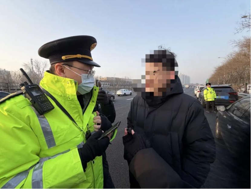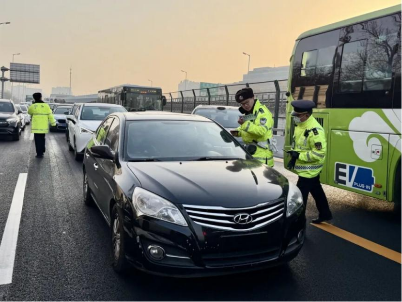 交警现场执法京通快速路违法临牌车/记者拍摄