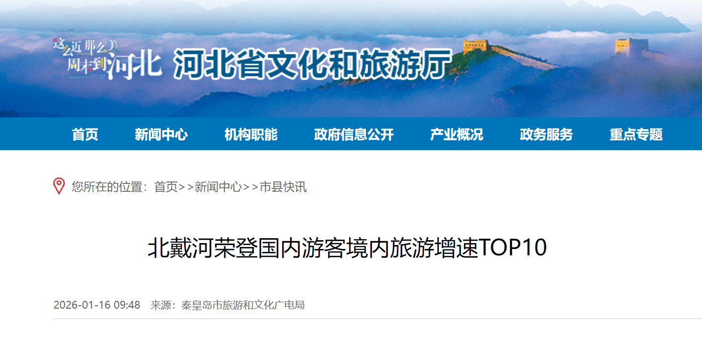 近日,携程集团发布《2025年度旅行报告》,在“2025中外游客旅行决策盘点”中,北戴河国内游客境内旅游增速同比近3倍,荣登国内游客境内旅游增速TOP10。北戴河的增长势能将进一步带动全市景区联动、业态升级,为秦皇岛打造全国滨海旅游目的地注入强劲动力,加速城市文旅品牌影响力提升。