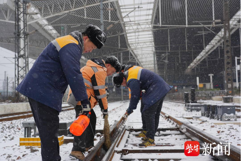 闻雪而动,向雪而行。南京、徐州供电段组织干部职工顶风冒雪巡视跨越线路、变配电所、电缆路径等关键设备设施,对信号专用发电机进行启机试验和状态确认,确保应急情况下信号供电正常。南京电务段对管内道岔、信号机等关键设备持续进行扫雪除冰,多措并举保障信号设备稳定运行。同时,针对雪后早晚温差较大时段,组织人员检查巡查防断重点地段,全方位筑牢雨雪冰冻天气铁路运输安全防线。徐州机务段迅速启动预警应急响应机制,严格执行24小时值班制度,迅速集结党团员突击队,组织开行除冰、防覆冰列车。南京动车段对入库动车组进行融雪除冰,及时清除车顶、转向架积雪,对存车场存放动车组,安排专人防寒打温,确保车体设备状态正常。南京房建公寓段重点对车站站房、雨棚、生产用房等设施的渗水、漏水情况开展细致排查,严防低温形成冰凌,为旅客出行筑牢安全防线。