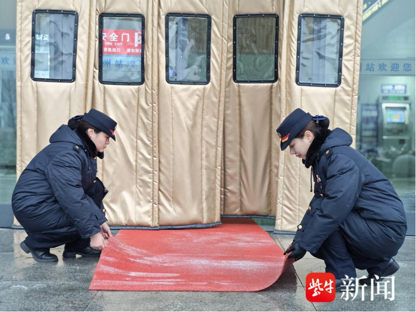 南京、徐州、连云港、宿迁、扬州、镇江等地车站针对因降雪天气导致的部分旅客列车晚点,在雷锋服务台增设工作人员,帮助旅客办理改签、退票手续,为候车旅客提供口罩、暖宝宝、充电器、老花镜等常备物品,做好重点旅客帮扶、信息咨询。同时,各车站积极协调地方交通运力,做好公交车、出租车、大巴车等汽运调配,方便旅客换乘。南京客运段组织在途职工在列车门口扫雪,铺垫硬纸板,对老幼病残孕和行动不便的旅客及时提供帮助,让旅客感受车外冰天雪地、车内暖意融融的温情旅途。