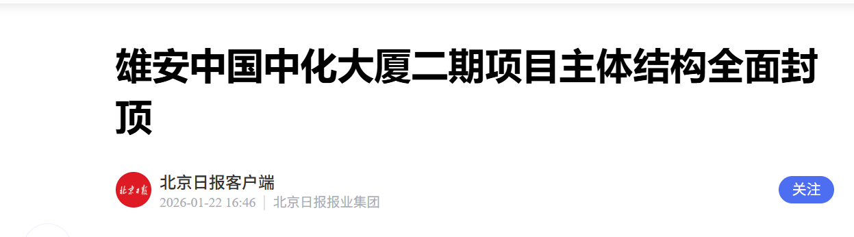 “雄安新区中国中化大厦二期项目主体结构全面封顶” 的相关文章