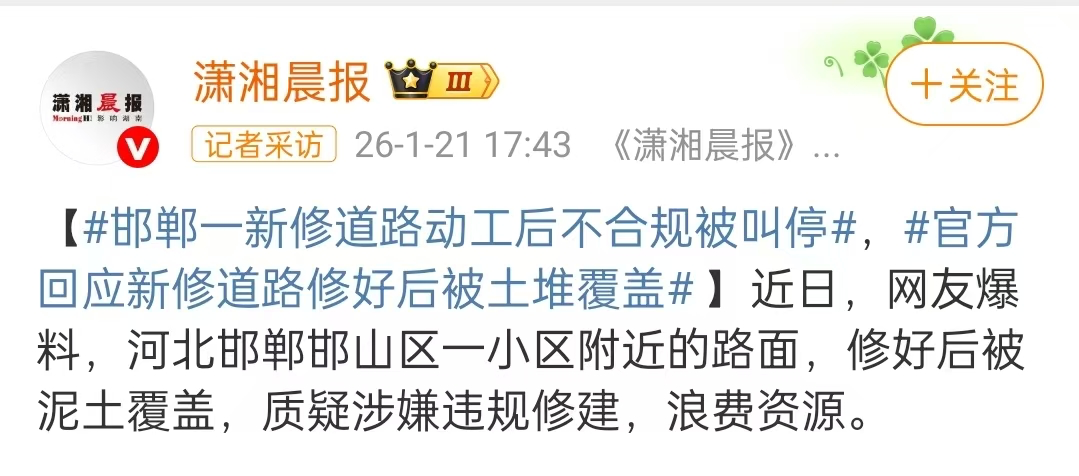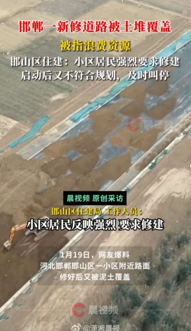 据潇湘晨报消息,近日,网友爆料,河北邯郸邯山区一小区附近的路面,修好后被泥土覆盖,质疑涉嫌违规修建,浪费资源。