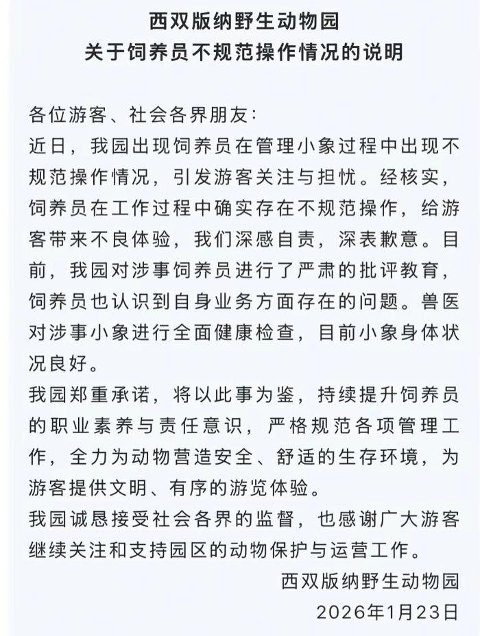 这份名为《西双版纳野生动物园关于饲养员不规范操作情况的说明》称,近日,该园出现饲养员在管理小象过程中出现不规范操作情况,引发游客关注与担忧。经核实,饲养员在工作过程中确实存在不规范操作,给游客带来不良体验,他们深感自责,深表歉意。目前,该园对涉事饲养员进行了严肃的批评教育,饲养员也认识到自身业务方面存在的问题。兽医对涉事小象进行全面健康检查,目前小象身体状况良好。