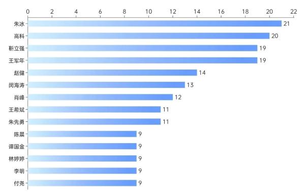 从创新主体来看,吉林大学个人与学院的创新活力同步迸发。发明人队伍中,32位发明人授权发明专利数量超15件,汽车工程学院朱冰教授以21件第一发明人授权发明专利,树立了个人创新产出的标杆;学院层面,汽车工程学院凭借深厚科研实力与紧密的产业结合优势,成为本年度授权发明专利数量最多的学院。