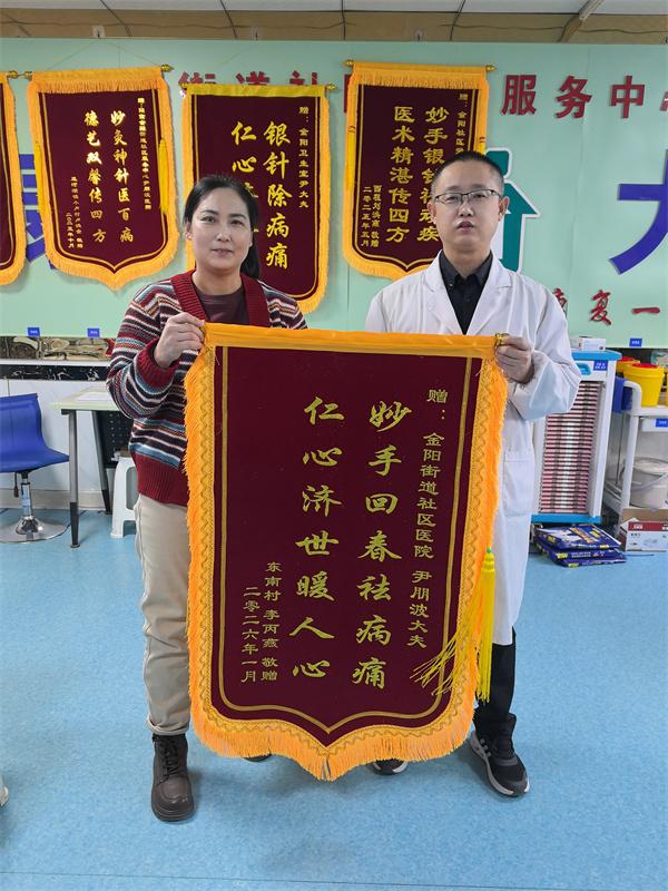 鲁网1月26日讯1月24日上午,市民李女士将一面写有“妙手回春祛病痛,仁心济世暖人心”的锦旗送到阳信县金阳街道社区卫生服务中心中医科尹鹏波大夫手中。
