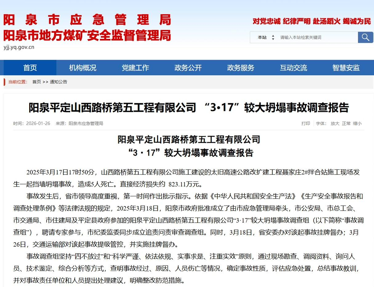 山西省阳泉市应急管理局1月26日公布《阳泉平定山西路桥第五工程有限公司“3·17”较大坍塌事故调查报告》。