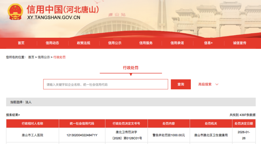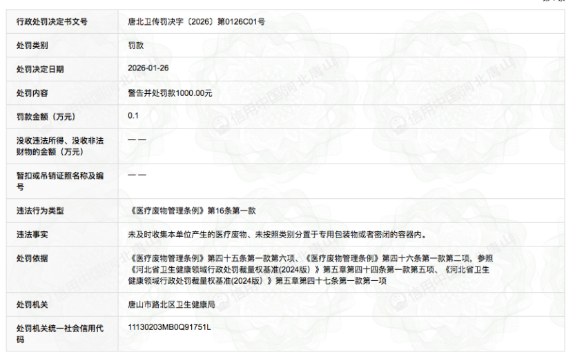 据信用中国(河北唐山)官网消息,2026年1月26日,因未及时收集本单位产生的医疗废物、未按照类别分置于专用包装物或者密闭的容器内,唐山市工人医院被唐山市路北区卫生健康局给予警告并处罚款1000元。