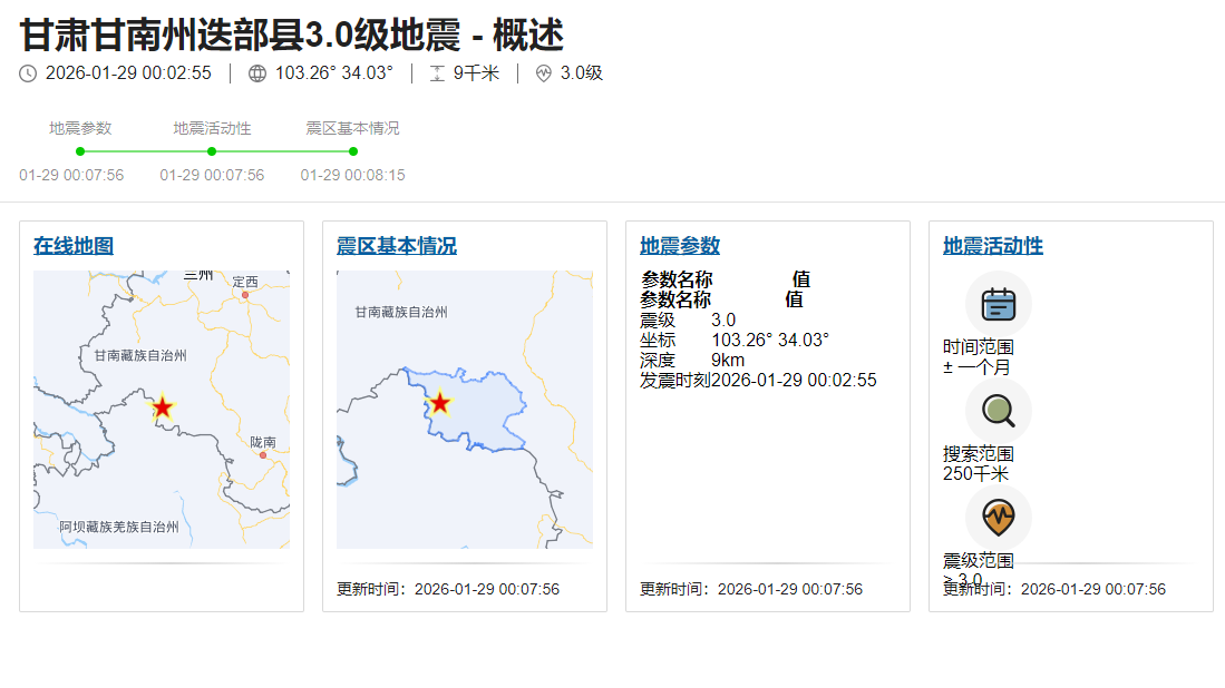 中国网1月29日讯 据中国地震台网中心消息,1月29日00时02分在甘肃甘南州迭部县(北纬34.03度,东经103.26度)发生3.0级地震,震源深度9千米。