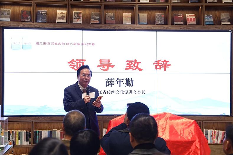 此次活动由浙江省思想政治工作研究会指导,浙江教育出版社集团、浙江省传统文化促进会联袂主办,文字里·浙版书店、天水街道、哈尔滨工程大学浙江校友会、淘品文化、浙江省报业协会等多家单位鼎力协办,以“遇见宋词·领略宋韵·腊八送福·喜迎新春”为主题,汇聚出版界、文化界、教育界数十位文人名士,同赴千年宋词之约,共襄《遇见宋词豪放派》《遇见宋词婉约派》两部新作揭幕的文化盛举,论道宋韵文化的传承、发展与创新之路。