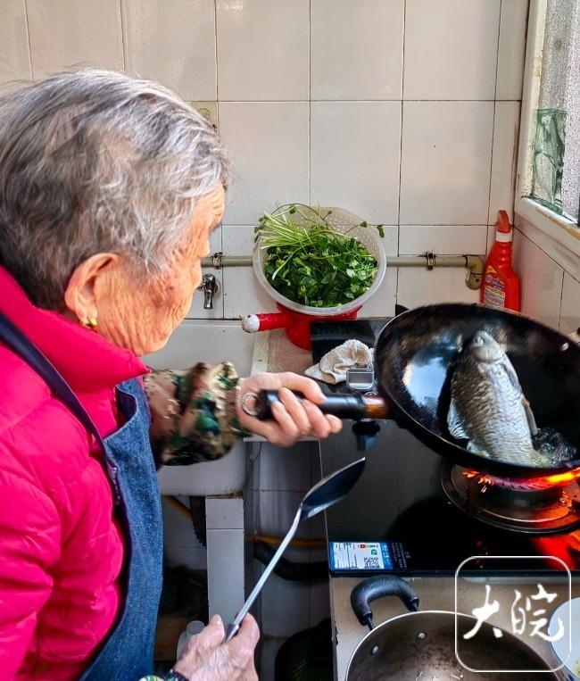 1月29日,百岁老人张学才亲自下厨烧鱼吃。