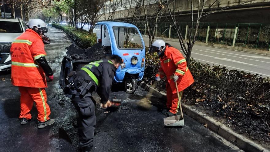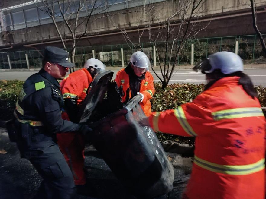 火势扑灭后,警消队员并未撤离,而是对现场展开细致检查,深入调查起火原因,确保现场无复燃风险。看到被烧成残骸的电动车,以及路面上布满的焦黑粘稠燃烧残留物,特巡警队员不顾扑救疲劳,主动协助环卫工人开展清理工作。