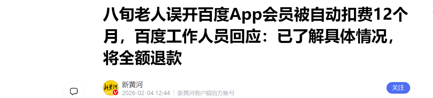 八旬老人误开百度App会员被自动扣费12个月 百度回应:将全额退款