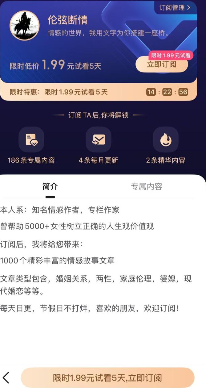 记者查询发现,这些订阅内容主要来自百家号平台上的视频创作博主。其中“伦弦断情”博主在个人简介中标明自己是“知名情感作者”,承诺订阅后将提供“1000个精彩丰富的情感故事文章”,内容涵盖婚姻关系、两性情感、家庭伦理等方面。其付费页面虽有“限时1.99元试看5天”的促销信息,但关于“试看到期后按25元/月自动续费,可随时取消”的提示则以小字形式呈现,不易被老年用户察觉。