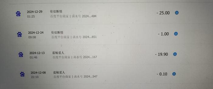张先生提供的支付记录显示,2024年12月8日,老人在名为“蓝鲸爱人”的百家号博主处支付了0.1元,五天后系统自动扣款19.9元;12月24日,在另一名博主“伦弦断情”处支付1元,五天后又自动续费25元。此后,系统持续自动扣款,累计金额达540元。