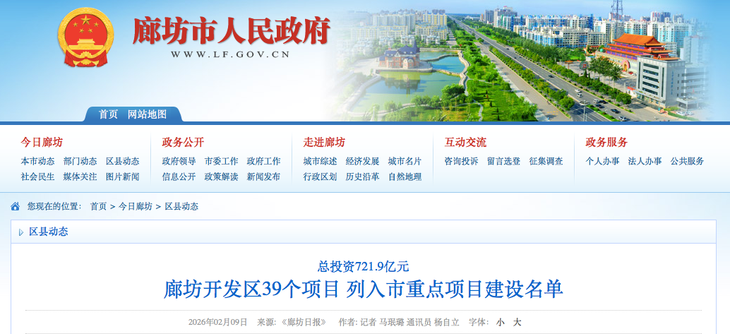 近日,廊坊市2026年市重点项目建设名单正式发布,廊坊开发区39个项目上榜,总投资721.9亿元。其中,续建项目19个、新开工项目20个,涵盖现代商贸物流、电子信息、高端装备制造、新材料新能源、生命健康、休闲文旅等相关产业领域,为区域高质量发展注入强劲动能。