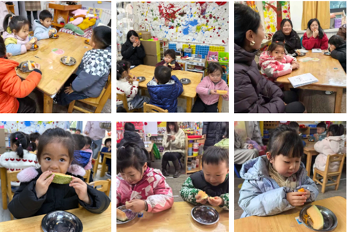 音乐游戏中,孩子们跟随节奏尽情舒展;故事分享时,害羞的小姑娘悄悄说出“在这里”,每一个细微的表达都被家长悉心捕捉。新年主题游戏环节,孩子们自由选择喜欢的角落,用黏土制作糖葫芦、用积木搭建“年夜饭餐桌”、在娃娃家为“客人”准备茶点,专注的模样让家长们倍感惊喜。游戏结束后,孩子们捧着作品奔向爸爸妈妈,趴在肩头诉说稚嫩心声,午餐时“自己握勺、独立进餐、主动送碗”的表现,更让家长们看到了孩子的独立与进步。