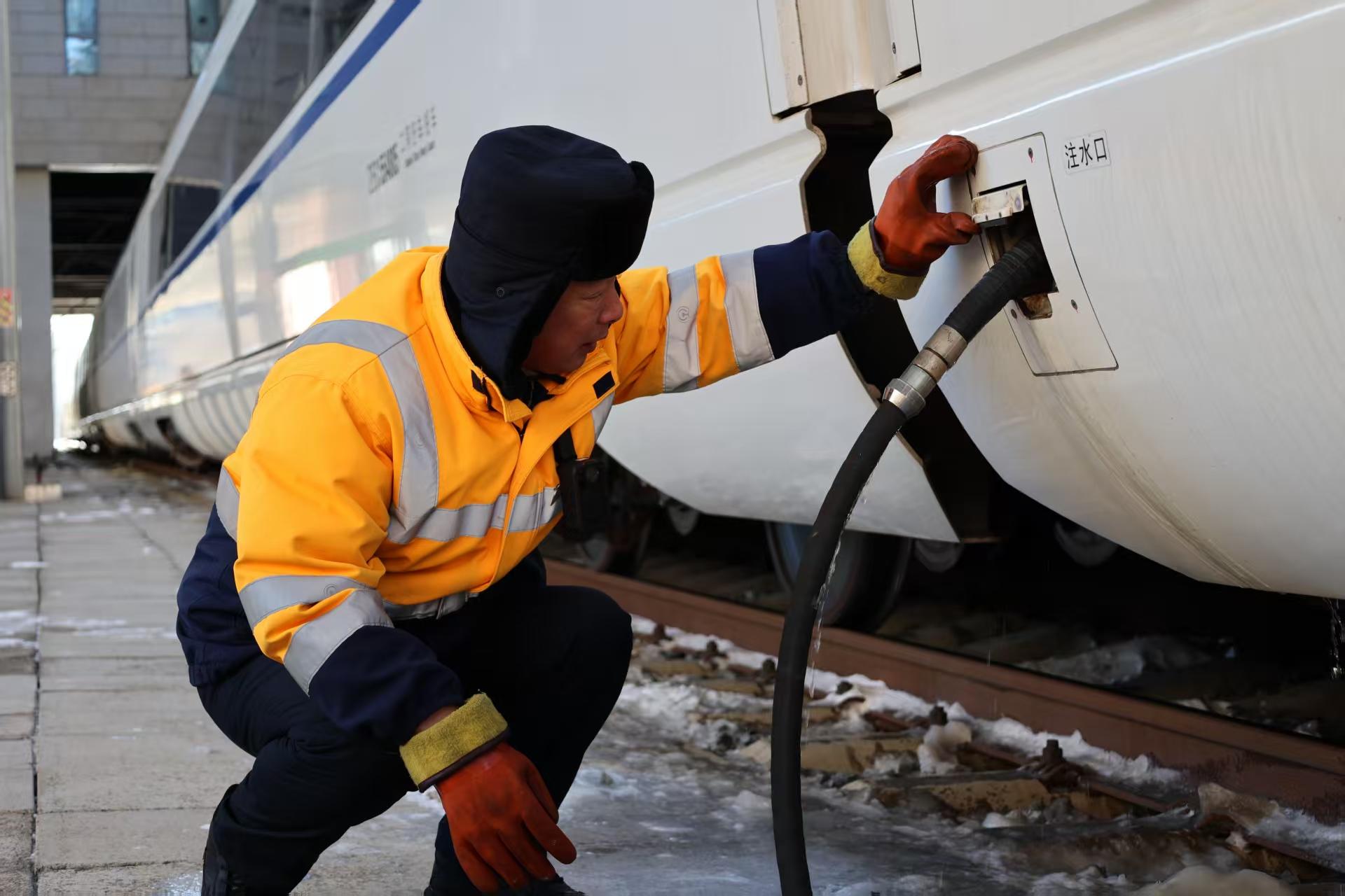 列车鸣笛驶出站台,张海滨和工友们目送着满载旅客的列车渐行渐远,脸上露出欣慰的笑容。他们搓了搓冻得僵硬的手,又转身投入到下一趟列车的上水作业中。