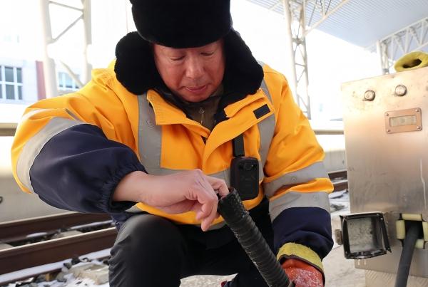 张海滨是吉林站上水班组的一名老职工,2026年6月份就要退休的他,这将是他战斗的最后一个春运。在-30℃的天气里,他和工友们的身影依旧穿梭在股道之间。