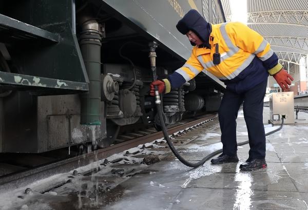 餐车是补水的重中之重。遇到餐车注水孔结冰,他就提着水壶,往注水孔上浇热水,等冰化开了,再迅速接上补水管。零下30℃的低温里,飞溅的水花落在手套上、裤脚上,转眼就结成了冰碴,他却浑然不觉,一心只盯着水表,为每节车厢水箱注满水。