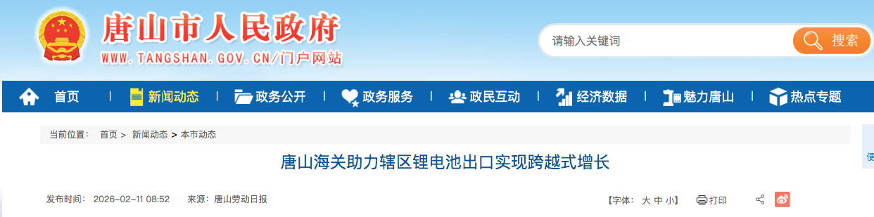 唐山海关辖区锂电池出口数据跨越式增长,既是唐山锂电池产业技术升级、产能提升的生动体现,更是唐山海关深化“放管服”改革、优化口岸营商环境的有力佐证。下步,唐山海关将持续聚焦企业需求,深化监管模式创新,强化政策精准赋能,助力更多“唐山制造”新能源产品扬帆出海。
