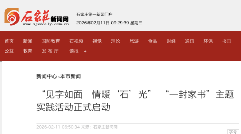 活动由石家庄市委宣传部、市委网信办、市委市直机关工委、石家庄邮政分公司等18家单位联合主办,石家庄日报社、石家庄广播电视台承办,旨在以“家书连四海情系石家庄”为核心脉络,以家书为情感载体,串联个人叙事与城市发展,进一步激发广大群众爱国爱家、向上向善情怀,提升“城市是我家,我要爱我家”的主人翁意识,大力营造热爱石家庄、建设石家庄的浓厚社会氛围。活动贯穿2026年全年,面向全体石家庄市民、外地的石家庄籍人士以及关心石家庄城市发展的外地朋友展开。
