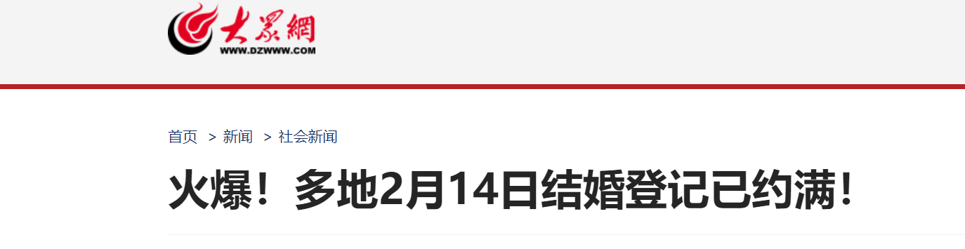 在江苏,据无锡发布2月3日消息,无锡各结婚登记点2月14日线上预约已全部约满。据苏州发布2月5日消息,苏州20多个结婚登记点位绝大部分已经约满。