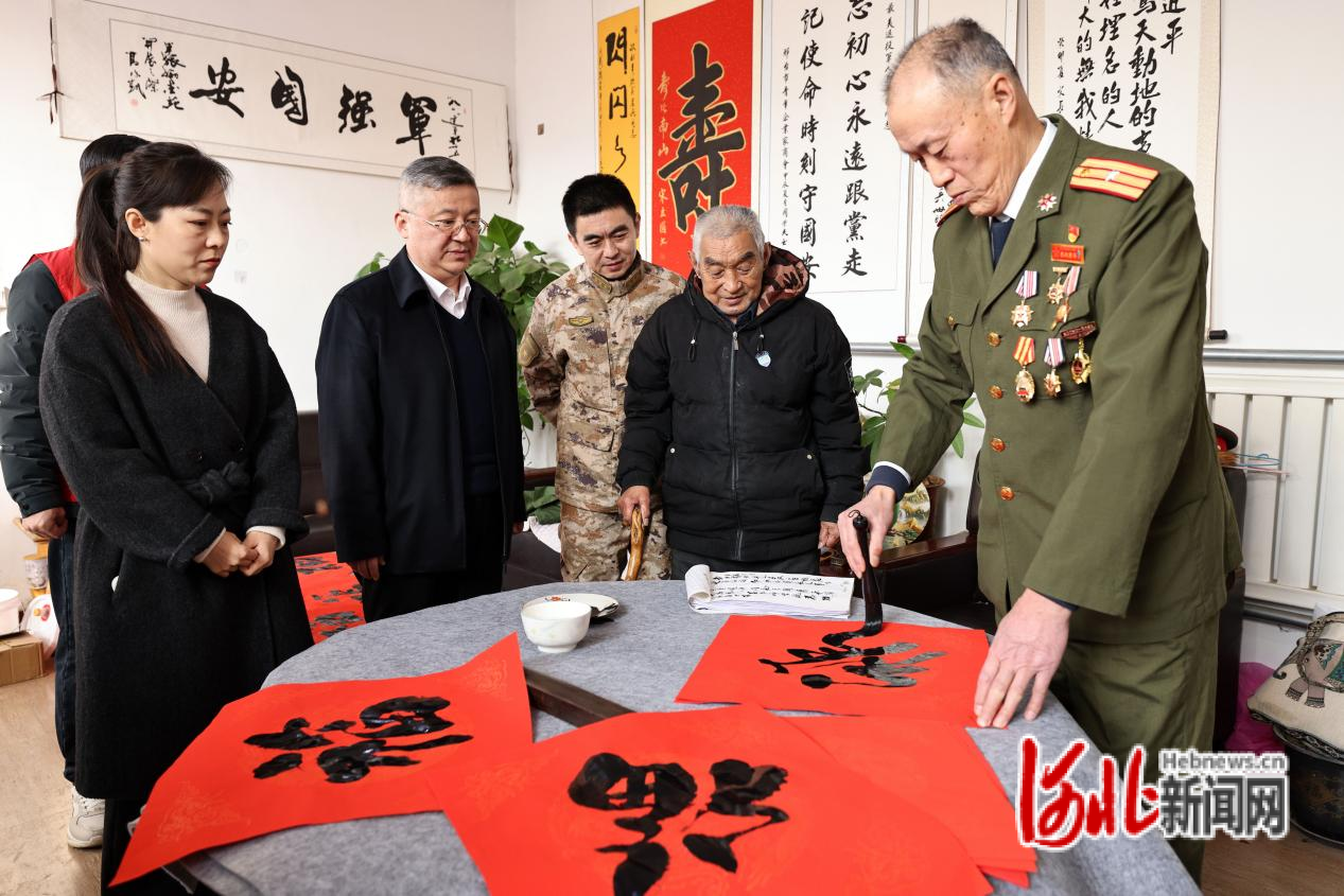 河北新闻网讯(王垒)新春将至,岁寒情暖。2月4日,邢台市广宗县退役军人事务局联合县人武部开展“笔墨传情暖老兵”新春慰问活动,邀请退役军人书法爱好者走进“全国最美退役军人”吴洪甫家中,以笔墨寄情,送去新春祝福。