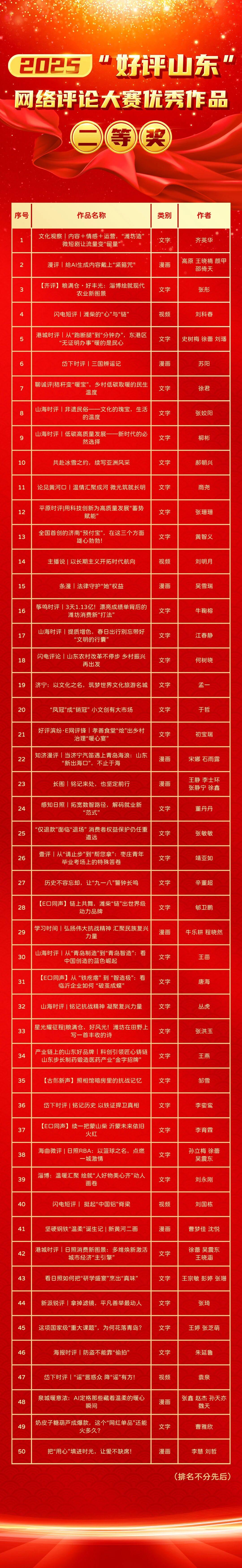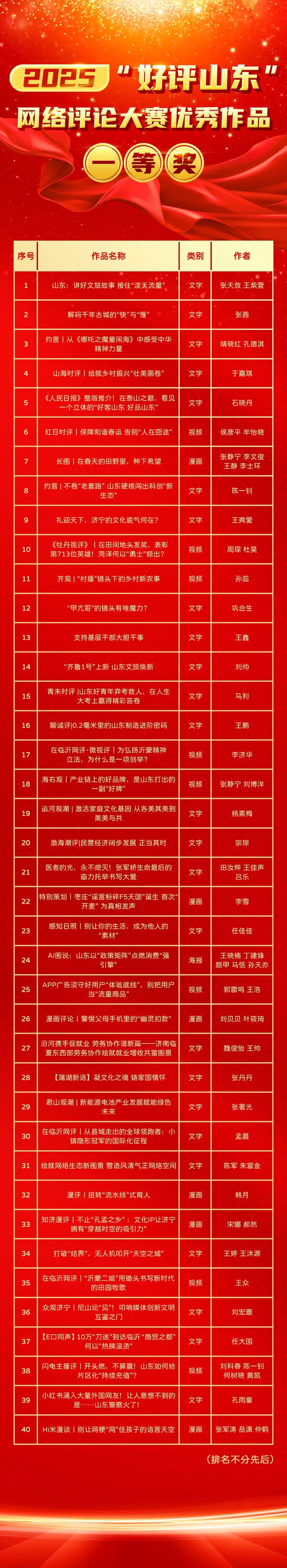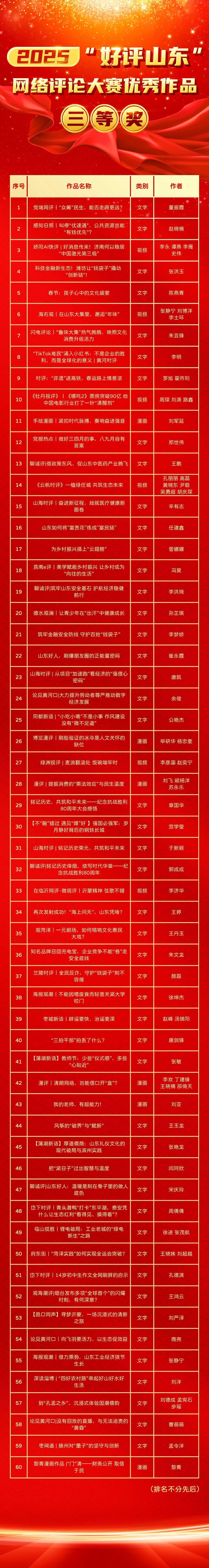 鲁网2月14日讯近日,由山东省委网信办主办的2025“好评山东”网络评论大赛结果揭晓。大赛共征集原创网络评论作品2.9万余件,内容涵盖新闻时事、网络文明、文化两创、乡村振兴等方面,涌现出一批接地气、形式新的优秀作品。按照活动安排,经多轮评审,最终评选出年度一等奖优秀作品40件、二等奖优秀作品50件、三等奖优秀作品60件。