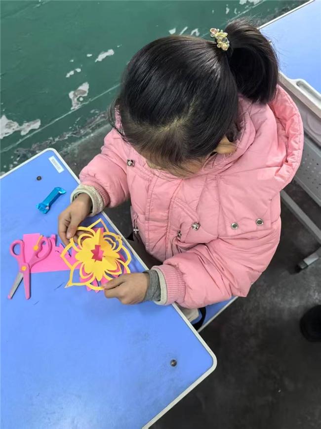 到了动手体验环节,实践队员们手把手地教孩子们如何折纸、如何构图、如何安全使用剪刀。虽然孩子们大多是第一次接触剪纸,但在大学生哥哥姐姐的鼓励下,他们大胆尝试,剪出了充满童趣的作品。看到自己亲手剪出的作品逐渐成形,孩子们的脸上洋溢着自豪与喜悦的笑容。