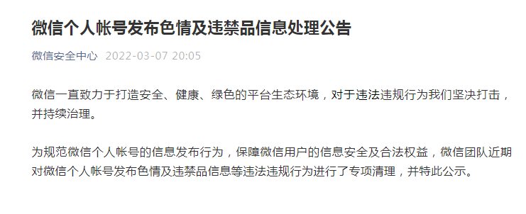 公告指出,微信一直致力于打造安全、健康、绿色的平台生态环境,对于违法违规行为微信坚决打击,并持续治理。为规范微信个人帐号的信息发布行为,保障微信用户的信息安全及合法权益,微信团队近期对微信个人帐号发布色情及违禁品信息等违法违规行为进行了专项清理,并特此公示。1