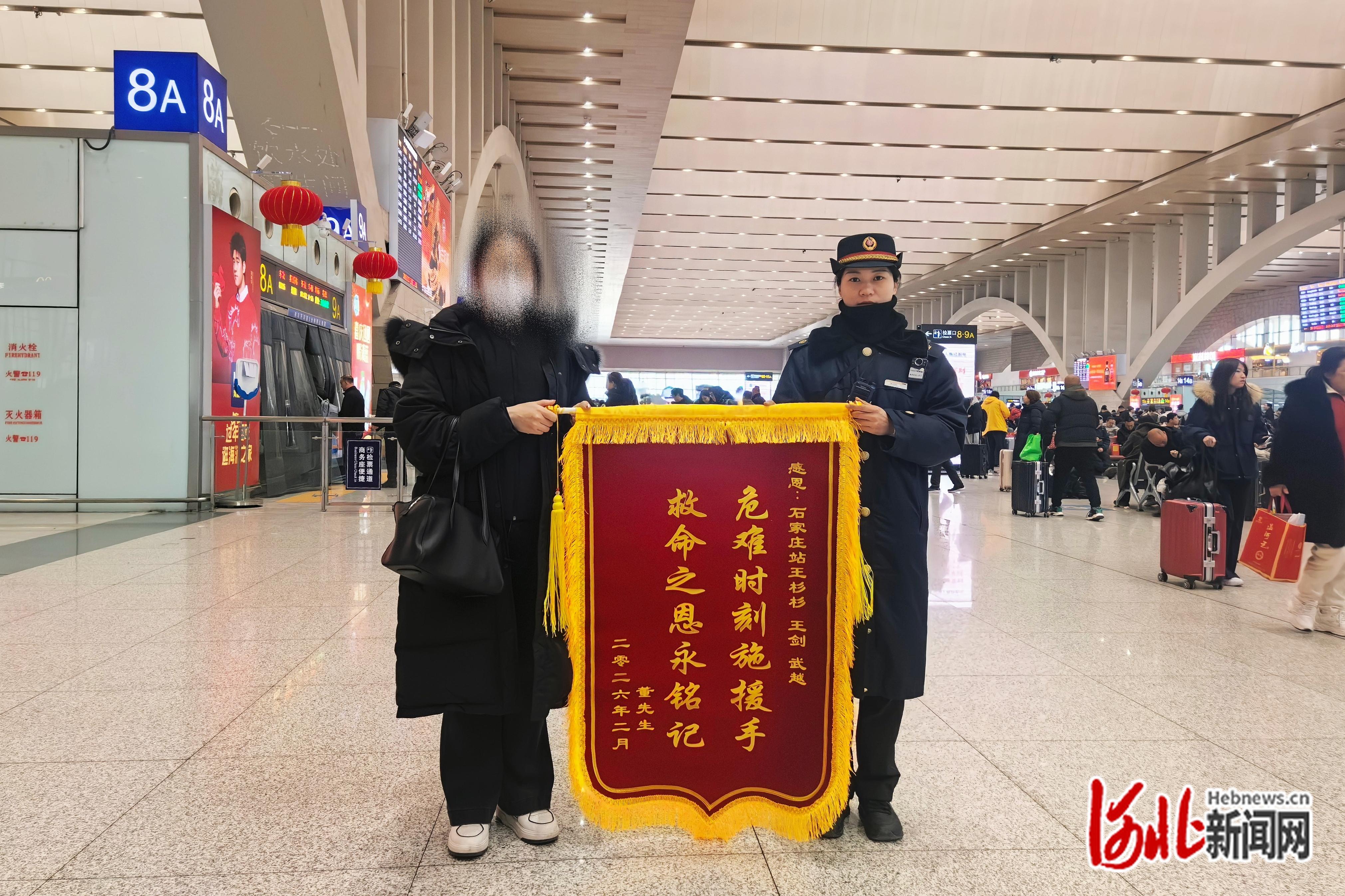 乘客家属给客运员王杉杉送锦旗表示感谢。石家庄站供图