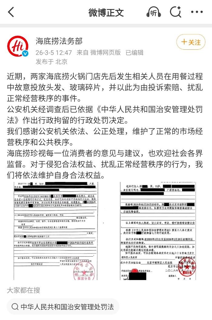 记者注意到,海底捞同步披露两份《行政处罚决定书》。其中一份显示,2026年3月,河南焦作一海底捞店,一男子在进店前口含玻璃碎片,后在吃饭的过程中将玻璃碎片吐出,谎称该海底捞店食物中有异物,并以此免单并获得店长赔偿,经调查后发现,该男子今年2月在河南洛阳一海底捞店以同样的方式获得免单和赔偿,该男子被公安机关依法处以行政拘留;另一份显示,2026年2月,一男子在北京一海底捞门店内以“餐饮卫生问题”实施敲诈勒索行为,公安机关依法作出行政拘留处罚决定。