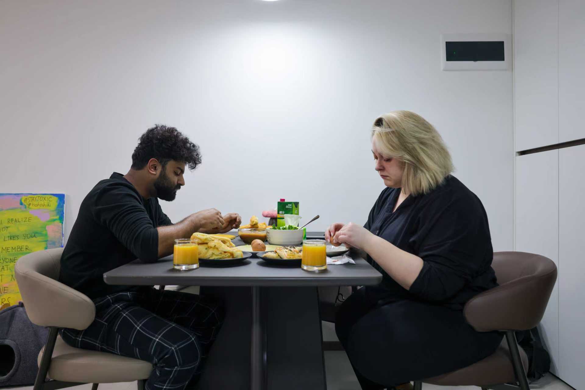 萨姆(左)和尤莉亚一同享用早餐。