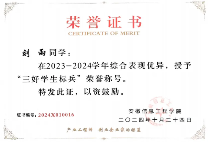 刘雨获得的荣誉证书。