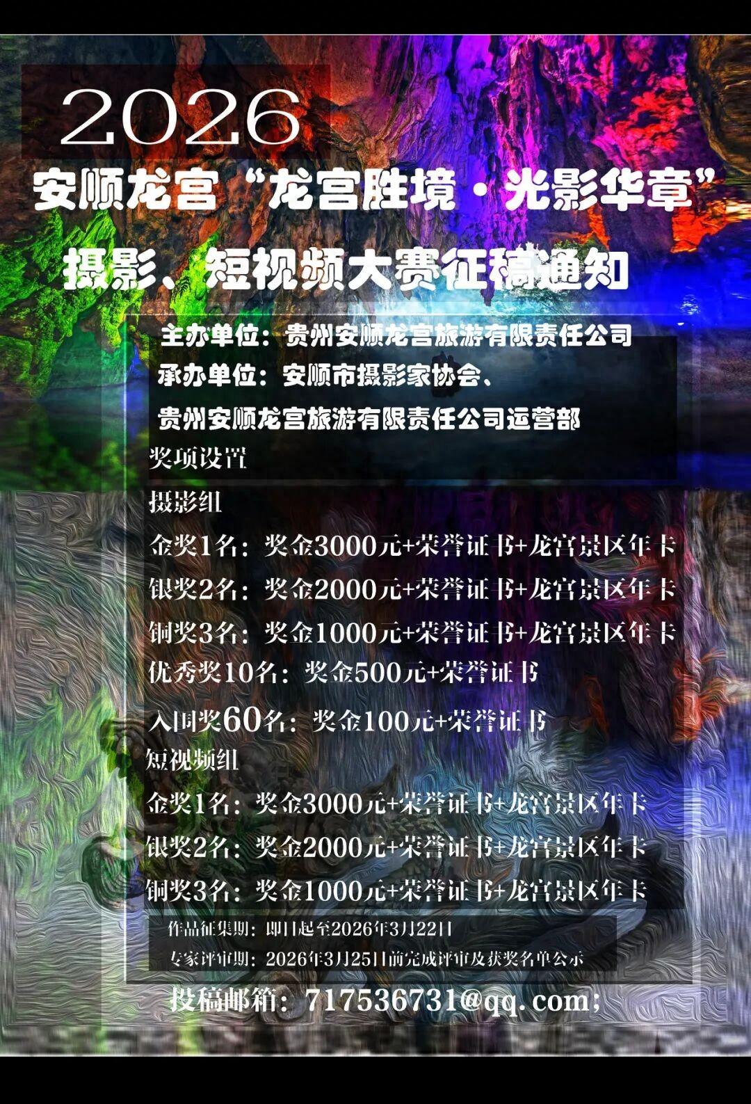为全景展现安顺龙宫景区自然生态之美、喀斯特地貌之奇、民俗人文之韵与文旅融合之新,全方位挖掘景区多元魅力,用镜头定格龙宫四季风光,以影像讲好龙宫故事,进一步提升龙宫景区品牌知名度与影响力,特举办2026年安顺·龙宫“龙宫胜境·光影华章”摄影·短视频大赛,现面向全社会公开征集优秀原创影像作品。具体事宜通知如下: