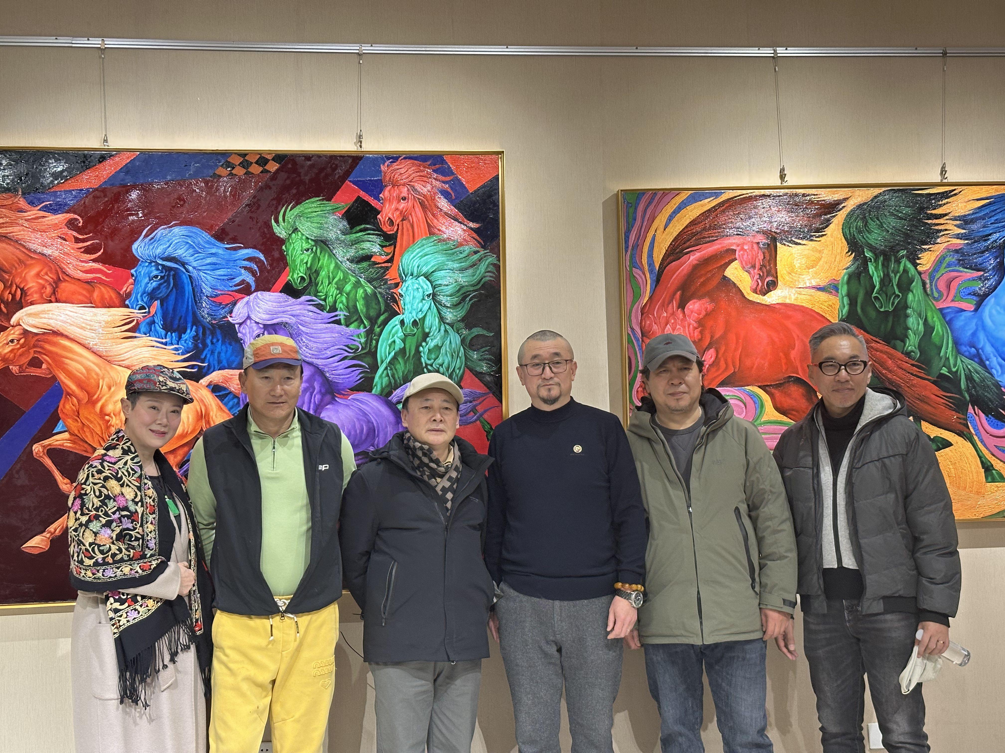 步入展厅,柔和的灯光洒在一幅幅充满张力的作品上,将“奔腾”的动态与“凝望”的静谧完美呈现。没有喧闹的背景音乐,取而代之的是嘉宾们轻声地交谈与杯盏相碰的清脆声响。艺术家姜广宇穿梭于人群之中,与老朋友、新面孔分享着每一件作品背后的灵感源泉、技法探索与情感寄托。现场准备了简单的美酒与点心,让这场艺术聚会更像一场老友间的雅集,学术探讨与情谊交流在不知不觉中交融共生。