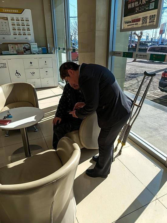 陈大哥因腿部残疾,下肢萎缩、行动不便,需要依靠双拐才能艰难行走。当他拄着拐杖走进网点大厅时,大堂工作人员第一时间发现了他的难处,立刻快步上前,细心搀扶,温柔地提醒他慢一点、小心脚下,并主动引导他来到休息区坐下休息。