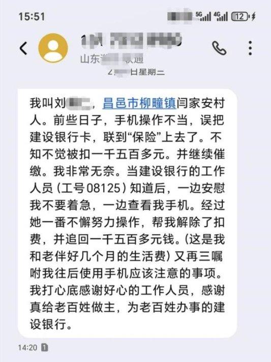 鲁网3月14日讯2月4日下午 ,建设银行潍坊昌邑支行负责人收到了一封来自昌邑市柳疃镇闫家安村一位老人的真挚感谢短信。这背后,是一个关于银行员工用专业与热心为客户排忧解难的暖心故事。