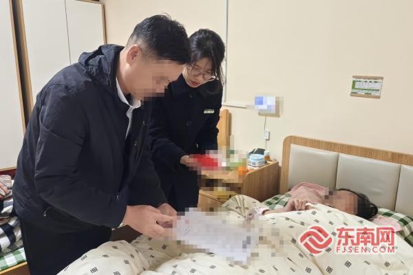 邮储银行连城县支行“邮爱驿站”服务小分队携带业务材料,专程驱车前往连城县社会福利中心。见到卧床的杨女士,工作人员俯身放慢语速,以温和语气耐心沟通,细致确认身份信息及业务意愿,全程动作轻柔、服务周到,用细节传递对老人的尊重与关爱。