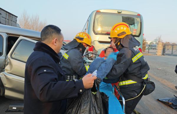中国吉林网、吉刻新闻记者得知,消防救援人员抵达现场后,经侦查发现:一辆面包车与客车尾部发生追尾碰撞,面包车车头严重变形,副驾驶位置损毁尤为严重,副驾驶及后排共4名人员被困。根据现场态势,救援人员迅速制定方案、展开施救。利用液压破拆、扩张器材对变形车体进行撑顶破拆,快速开辟救援通道。救援过程中,指战员全程与被困人员沟通交流,安抚情绪、保持其意识清醒。